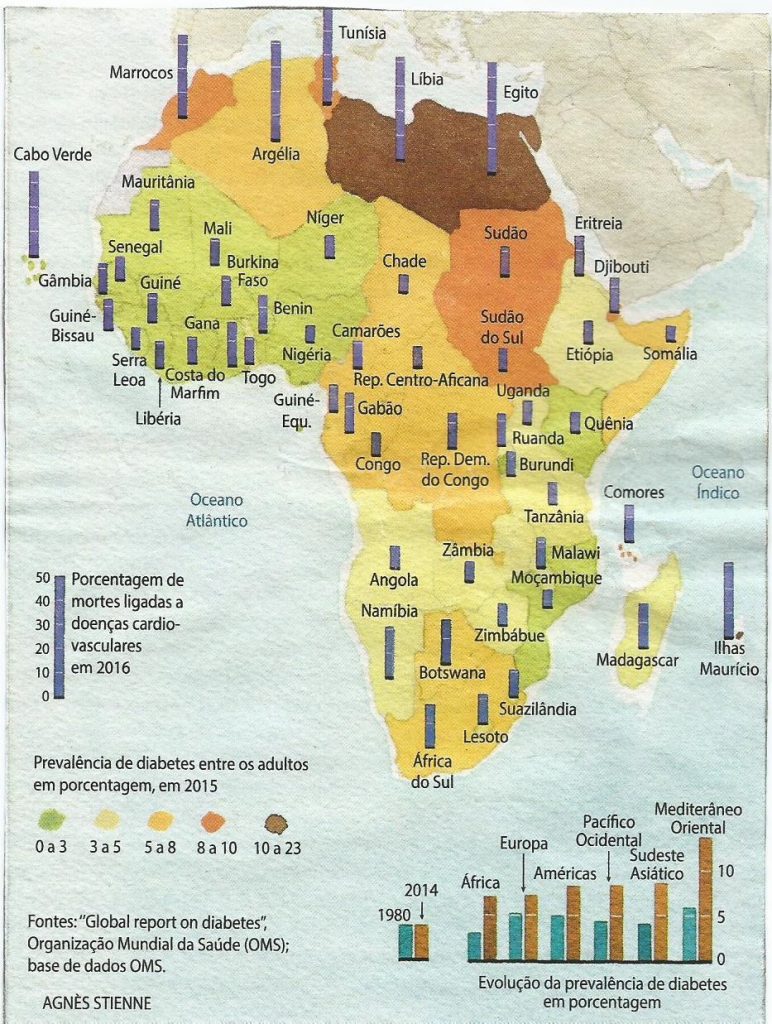 […] Nos países africanos mais pobres, estima-se que 75,1% dos indivíduos que convivem com diabetes mellitus não sejam diagnosticados. Naqueles que têm rendas baixas ou intermediárias (Gabão, África do Sul e Quênia, por exemplo), a atenção – justificada – dada às doenças transmissíveis (como HIV/aids, tuberculose e malária) freou o reconhecimento das DNTs.