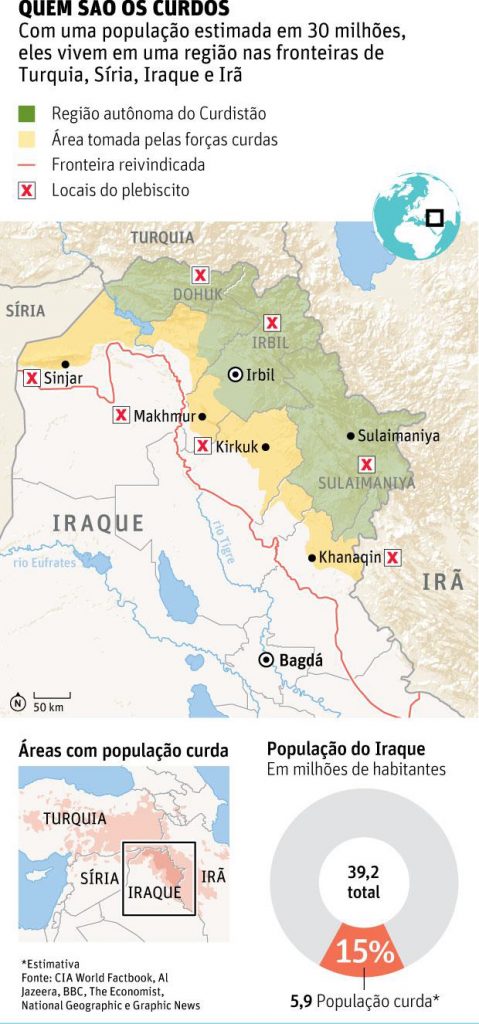 e) Dos 30 milhões de curdos espalhados pelo Oriente Médio, cerca de 5,9 milhões vivem no interior do Iraque. Foi esta parcela da etnia que foi convocada a participar do plebiscito.
