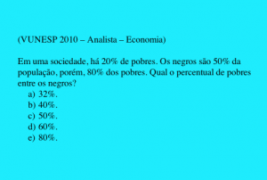 Em uma sociedade, há 20% de pobres. Os negros são 50% da população, porém, são 80% dos pobres. Qual o percentual de pobres entre os negros?