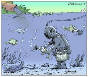 d) Tanto o texto quanto a charge fazem alusão à poluição dos recursos hídricos – por meio do despejamento de esgoto – que compromete a vida aquática (no caso da charge) e dos seres humanos (no caso do texto).