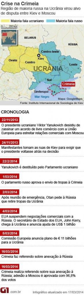 (mapa temático e cronologia da crise na crimeia em 2014; fonte: G1)