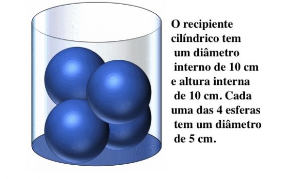 Resposta: Uma maneira de abordar o problema é considerar a visão de cima. Veremos que o copo como um circulo. Dentro estão as bordas circulares para as duas esferas de cima, que se tangenciam e tangenciam o copo. As duas esferas do fundo estão rotacionadas em 90 graus em […]