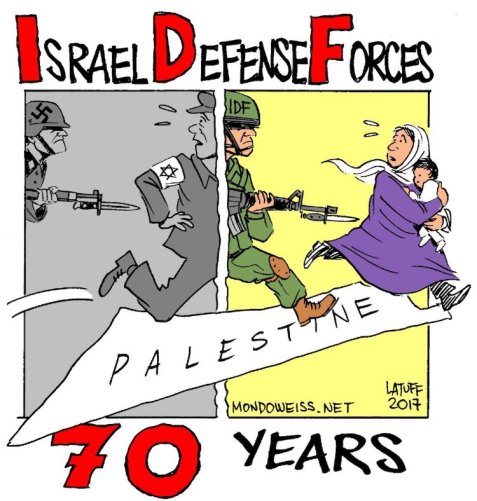 b) A charge faz uma crítica à perseguição que os judeus promovem contra os palestinos desde que o Estado de Israel foi criado.