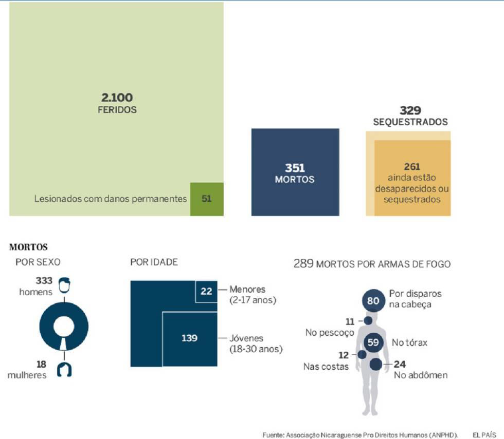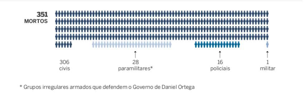 A Nicarágua terminou a semana mergulhada em uma nova onda de protestos contra o governo de Daniel Ortega. Dezenas de milhares de pessoas saíram às ruas para pedir a destituição do ex-guerrilheiro sandinista, que décadas atrás lutou para acabar com a ditadura da família Somoza, apoiada pelos Estados Unidos, e agora é acusado de querer se perpetuar no poder. O país está mergulhado em sua pior crise política desde o final da guerra civil, em 1990. A repressão praticada pelo Governo de esquerda a manifestações contra seu mandato já deixou, desde 19 de abril deste ano, um saldo de 351 mortos – sendo 306 civis e 22 menores de 17 anos. Os dados da Associação Nicaraguense Pró-Direitos Humanos (ANPHD) também apontam que 261 pessoas estão, neste momento, desaparecidas ou sequestradas. Ortega nega as acusações e afirma que os protestos são uma cortina de fumaça para as intenções da direita, que quer tirá-lo do poder.