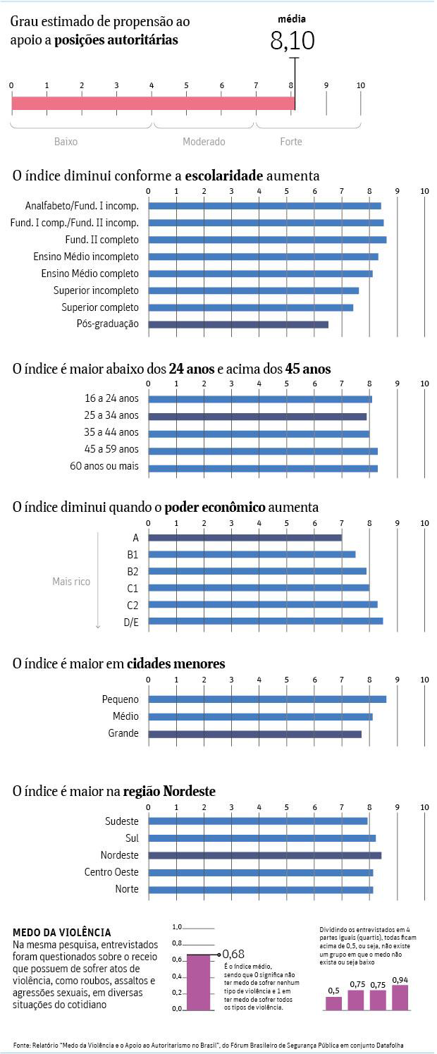 Com base em pesquisa encomendada ao instituto Datafolha, a medição indica que, numa escala de zero a dez, a sociedade brasileira atinge o elevado índice de 8,1 na propensão a endossar posições autoritárias.