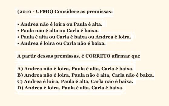 (UFMG 2010 – Assistente de Administração) Considere as premissas: • Andrea não é loira ou Paula é alta. • Paula não é alta ou Carla é baixa. • Paula é alta ou Carla é baixa ou Andrea é loira. • Andrea é loira ou Carla não é baixa. A partir […]