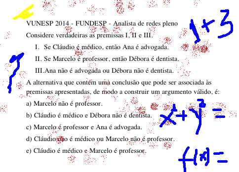 VUNESP 2014 – FUNDESP – Analista de redes pleno Considere verdadeiras as premissas I, II e III. Se Cláudio é médico, então Ana é advogada. Se Marcelo é professor, então Débora é dentista. Ana não é advogada ou Débora não é dentista. A alternativa que contém uma conclusão que pode […]
