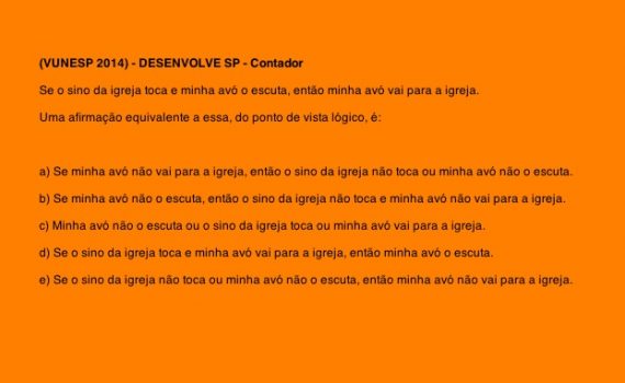 (VUNESP 2014) – DESENVOLVE SP – Contador Se o sino da igreja toca e minha avó o escuta, então minha avó vai para a igreja. Uma afirmação equivalente a essa, do ponto de vista lógico, é: a) Se minha avó não vai para a igreja, então o sino da igreja […]
