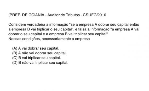 (PREF. DE GOIANIA – Auditor de Tributos – CSUFG/2016) Considere verdadeira a informação “se a empresa A dobrar seu capital então a empresa B vai triplicar o seu capital”, e falsa a informação “a empresa A vai dobrar o seu capital e a empresa B vai triplicar seu capital”. Nessas […]