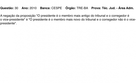 A negação da proposição “O presidente é o membro mais antigo do tribunal e o corregedor é o vice-presidente” é “O presidente é o membro mais novo do tribunal e o corregedor não é o vice-presidente”. Autor: Prof. Fábio Matos “Aulas Particulares de Calculo, Física e Matemática” (11) 97226-5689 […]